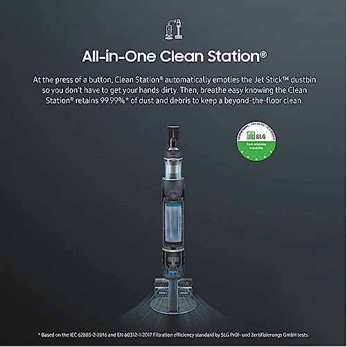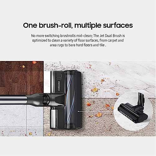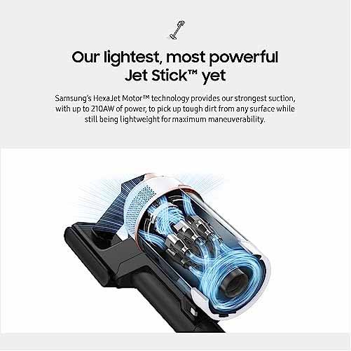 At the press of a button, Clean Station® empties the BESPOKE Jet Cordless Stick Vacuum’s dustbin, trapping 99.99%* of dust and debris for a beyond-the-floor clean. Samsung's HexaJet Motor™ technology provides suction with up to 210AW of power for superior household cleaning on carpets and hard floors, while still being lightweight for maximum maneuverability. No more switching brush-rolls mid-clean. The Jet Dual Brush is optimized to clean a variety of floor surfaces from carpet to hard floors to tile. Innovative features and our most premium finishes and colors for a vacuum so stunning, you'll want to show it off. *Based on the IEC 62885-2:2016 and EN 60312-1:2017 Filtration efficiency standard by SLG Pruf-und Zertifizierungs GmbH tests. **Based on the IEC 62885-2 Cl. 5.11 standard by SLG Prüfund Zertifizierungs GmbH tests. ***Microdust particles include particle sizes from 0.5 to 4.2 micrometers in diameter. ****Stated run time applies to the minimum power level with a nonmotorized tool attached. Battery runs for 60 minutes on Min mode, 30 minutes on Mid mode, 10 minutes on Max mode, and 3 minutes on Jet Mode.