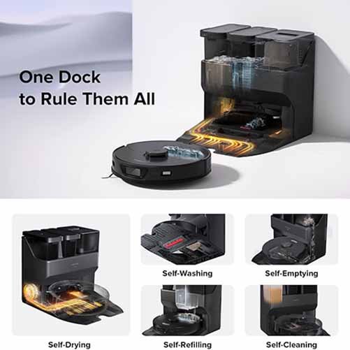 Self-Refilling, Self-Cleaning, Self-Drying, Self-Emptying, Robot Vacuum and Mop Combo, Powerful 5500Pa Suction, Sonic Mopping Area, Intelligent Brush/Mop Lifting, Precision Laser Smart Mapping & Navigation, Low Noise, Ultrasonic Carpet Detection, App Control: Variable Suction Control, Multi-Floor Mapping, No-Go Zone, Advanced Custom Cleaning, Scheduling; Pet Hair Pick Up, Works with Alexa, Auto-Docking, Anti-Fall, Cordless, Edge Cleaning, Washable Filter, Automatic Dust Collection, Reactive Tech Obstacle Avoidance, Auto Mop Washing, VibraRise Mopping System