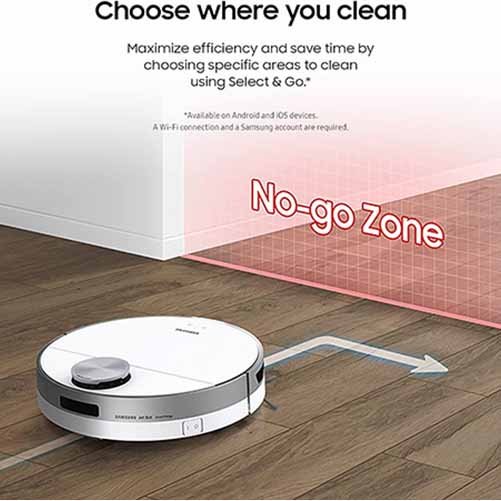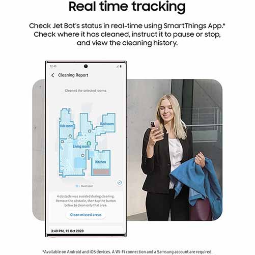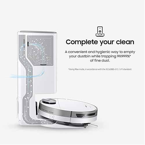 The new Samsung Jet Bot+ Robot Vacuum Cleaner & Clean Station with advanced LiDAR sensors uses precision mapping to clean your home more efficiently, using detailed floor maps controlled via your mobile device. Identify the type of floor surface and power needed to clean thoroughly and deeper into carpets with power control technology. Use the touchless, hygienic Clean Station to automatically empty the dustbin and prevent dust from being released back into your home. Comprehensive 5-layer HEPA filtration system traps up to 99.99% of dust. Select where the cordless vacuum should or should not clean right from your smartphone. Jet Bot+ recognizes rooms and cleans areas selectively based on your preferences. Check Jet Bot+'s status using the SmartThings App. Quickly view movement on a map of your home from wherever you are and see where it has cleaned, instruct it to pause or stop, and view its cleaning history. The 0.3-liter dustbin is fully washable. The high-efficiency brush has fine, anti-static fibers and self-cleaning extractors to avoid tangles. Clean your home using voice recogntion, compatible with Bixby, Google Assistant, and Amazon Alexa.